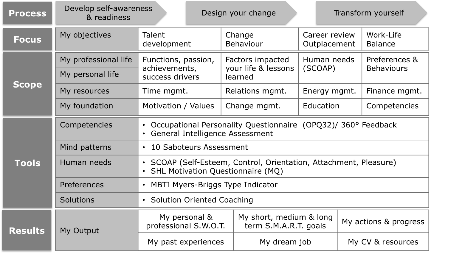 Minds & Brains designed (PPLO) to help you achieving a sustainable personal and professional transformation aligned with your passion and goals. (PPLO) approach illustrated below will address your personal and professional life, personal resources as well your foundation. What is worth to you to be personally and professionally satisfied and fulfilled for the next coming years? It is time to take ownership of your life and your career.